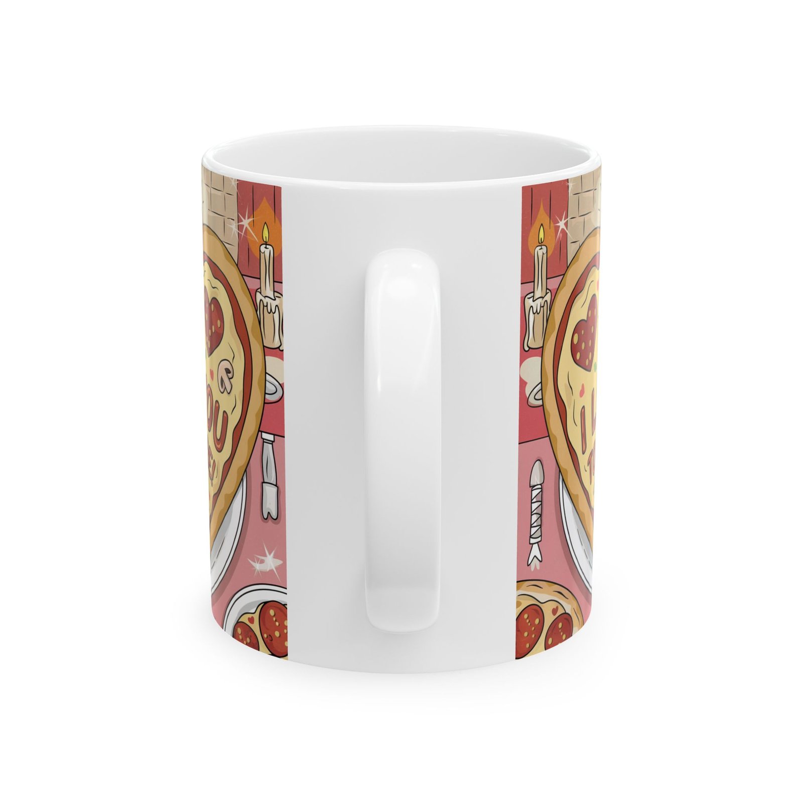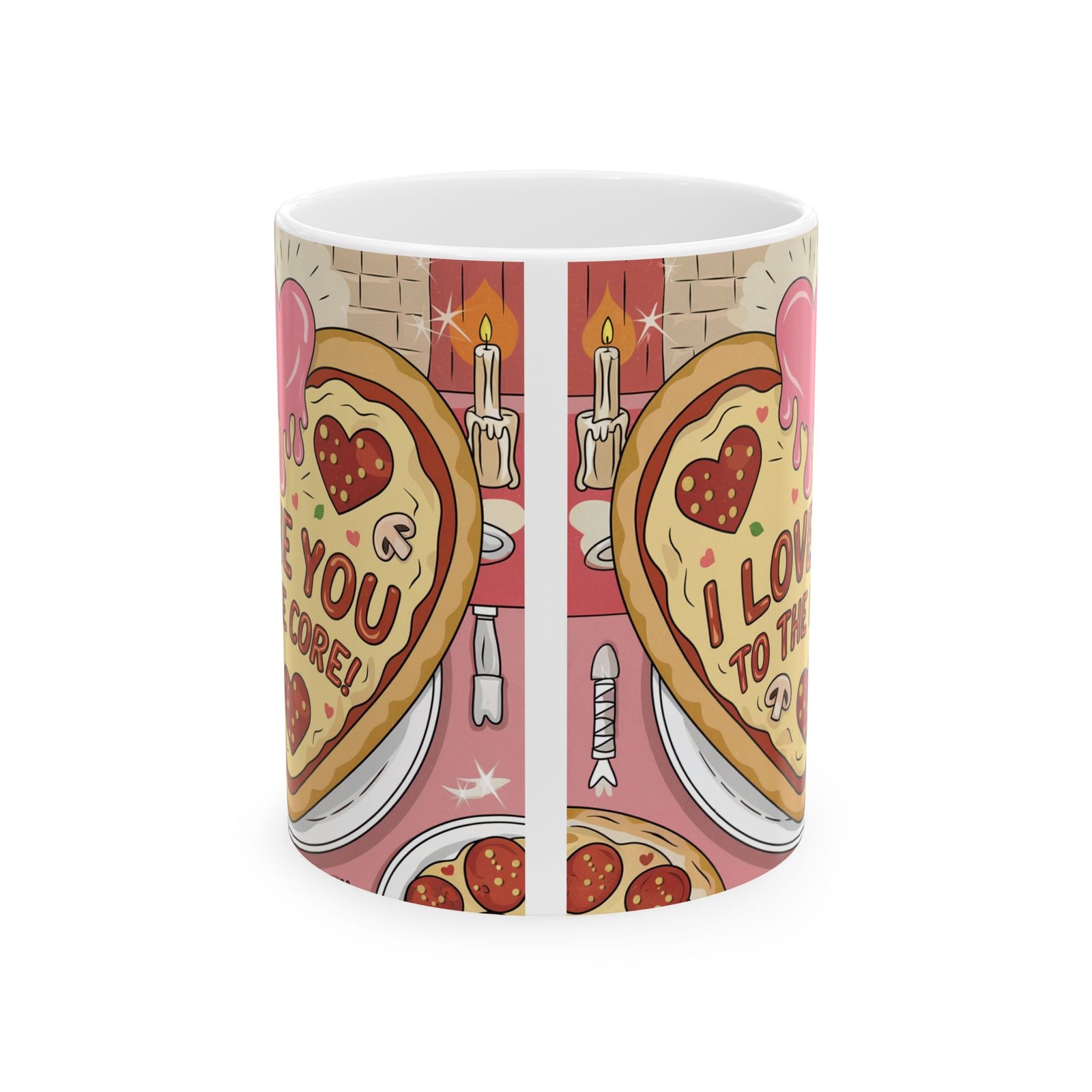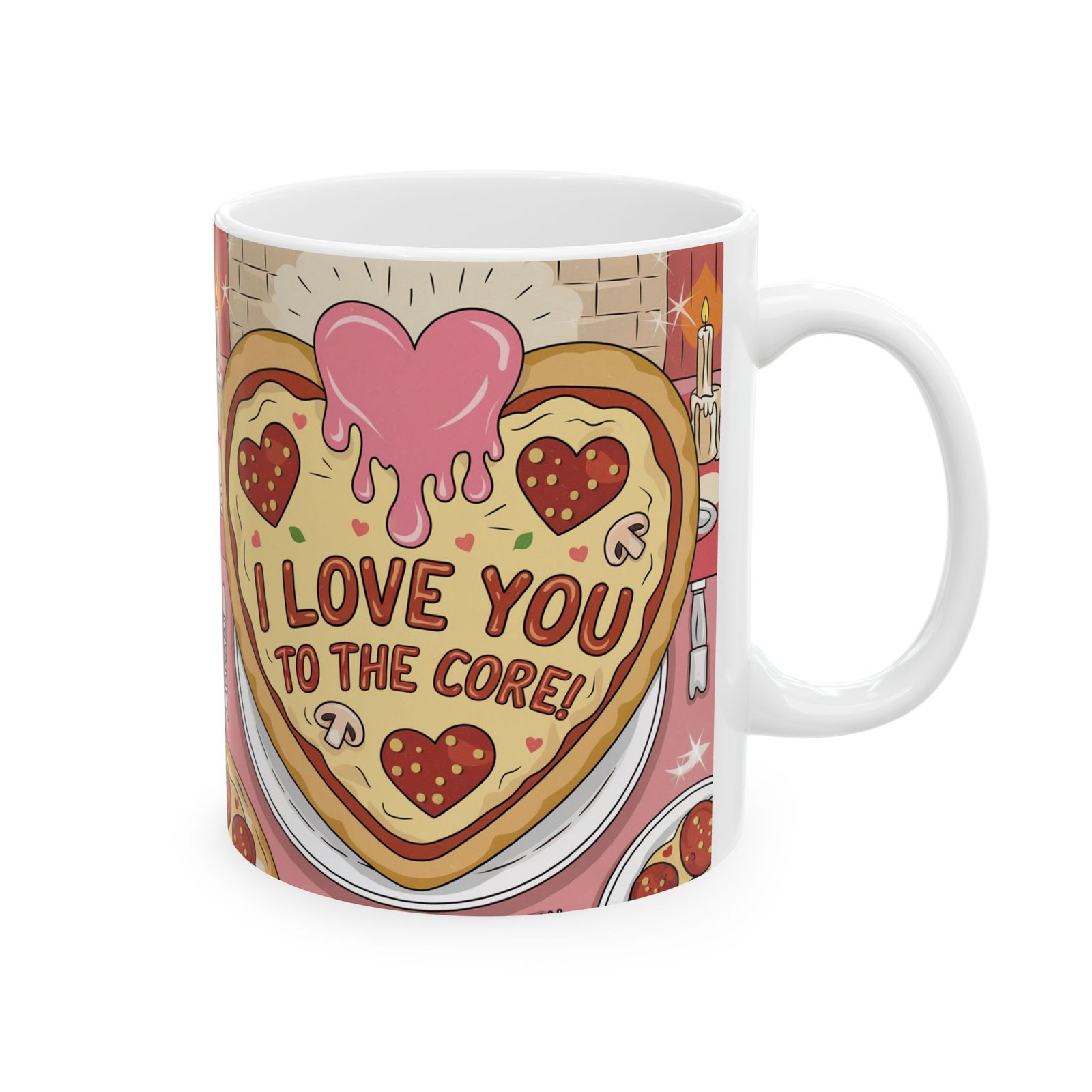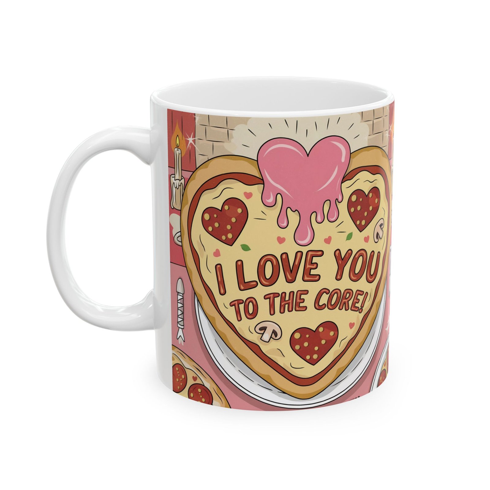 Cute Valentine’s Day mug with the words “I Love You to the Core” on a pizza. It’s BPA and Lead-free, microwave & dishwasher-safe, and made of white, durable ceramic in an 11-ounce size.