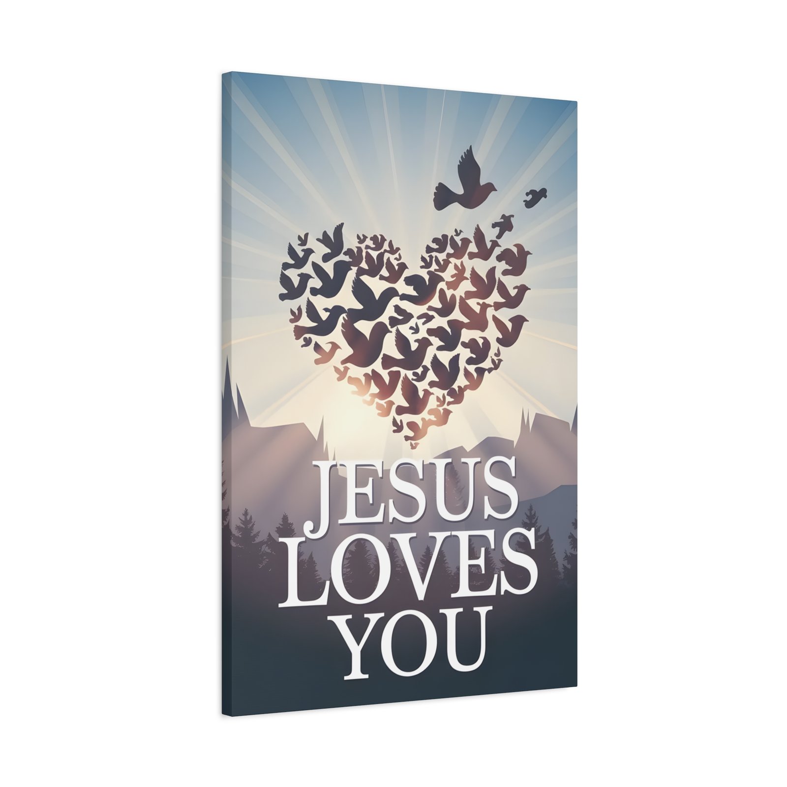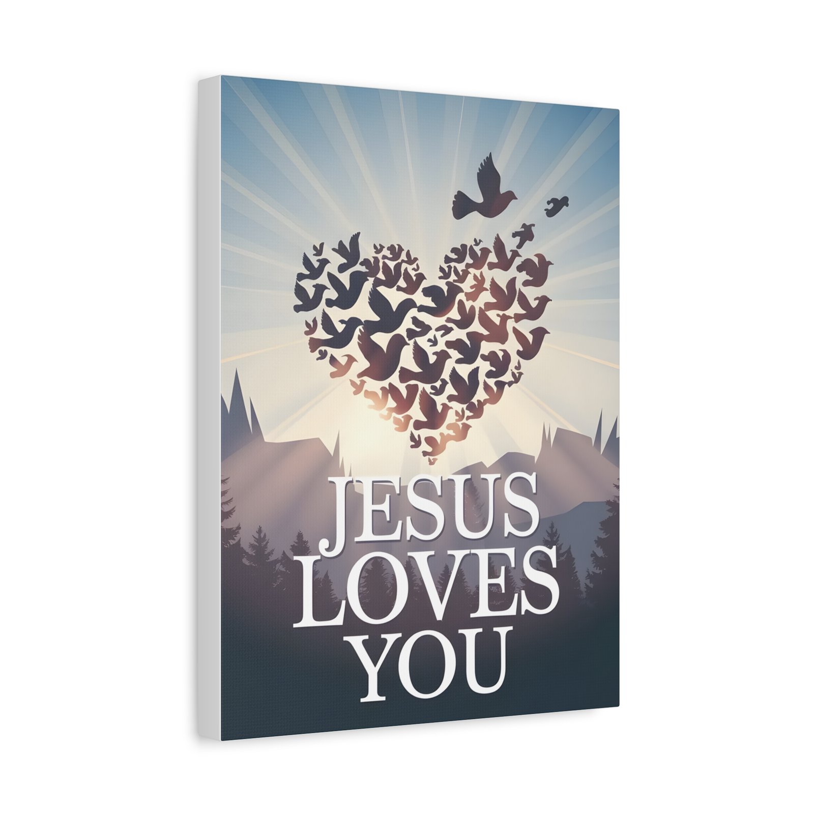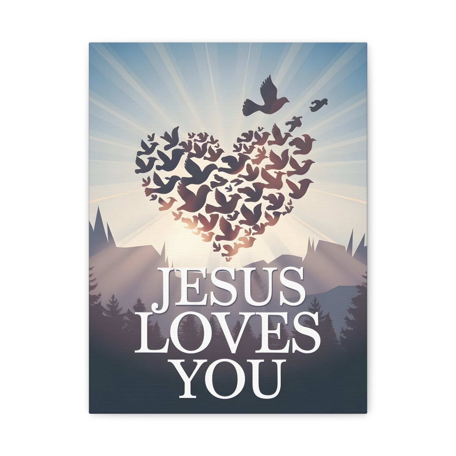 A serene, faith-forward canvas that brings a quiet, hopeful presence to any room. Soft morning light spills over distant mountain ridgelines while a flock of birds forms a heart above the treetops, carrying the gentle message “JESUS LOVES YOU.” The matte stretched canvas finish mutes glare and deepens color, so the warm pastels and layered silhouettes feel like a breath of calm every time you pass it. Hang it in a living room, entryway, nursery, or small chapel to anchor the space with comfort and a reminder of grace.