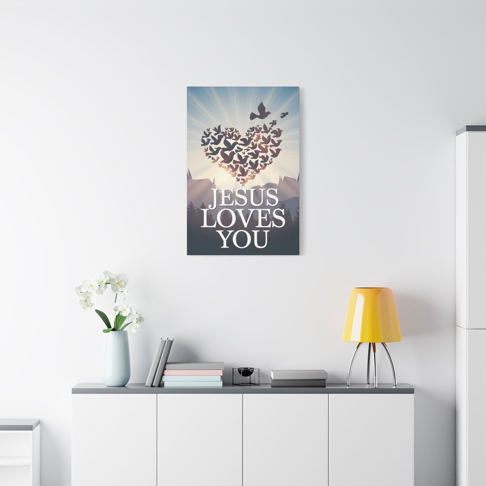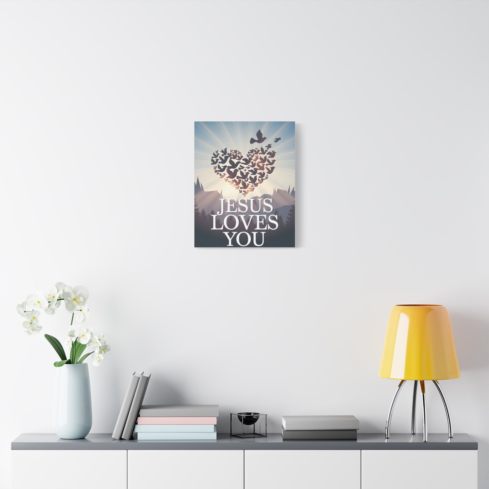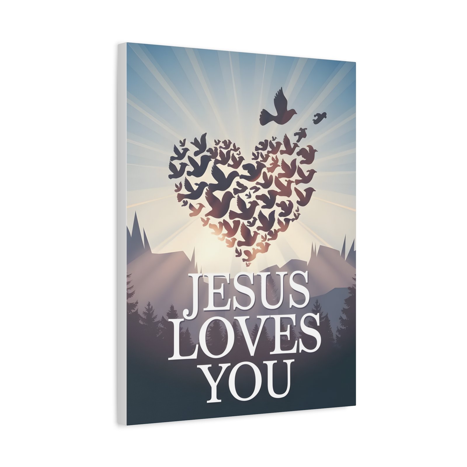 A serene, faith-forward canvas that brings a quiet, hopeful presence to any room. Soft morning light spills over distant mountain ridgelines while a flock of birds forms a heart above the treetops, carrying the gentle message “JESUS LOVES YOU.” The matte stretched canvas finish mutes glare and deepens color, so the warm pastels and layered silhouettes feel like a breath of calm every time you pass it. Hang it in a living room, entryway, nursery, or small chapel to anchor the space with comfort and a reminder of grace.